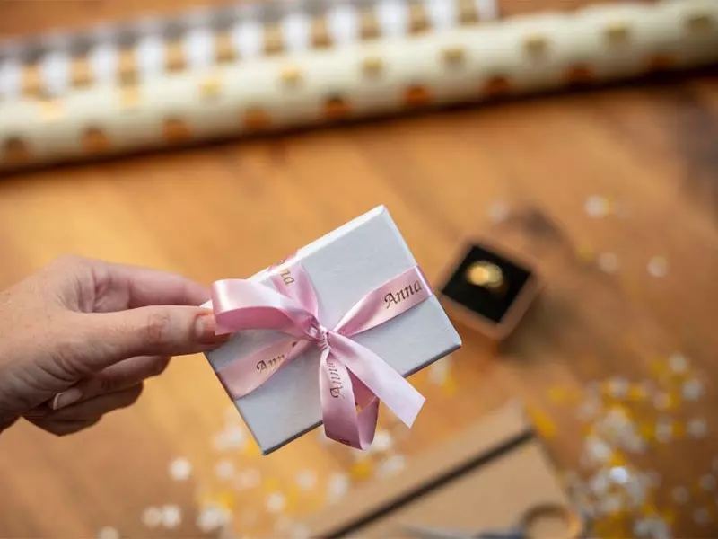 Ikke klæbende gavebånd til alle Brother P-Touch maskiner, som kan printe på 12 mm tape. TZeR234 gavebånd er 12 mm bred og med guldfarvet tekst på hvidt bånd